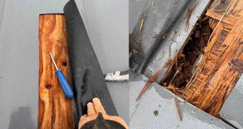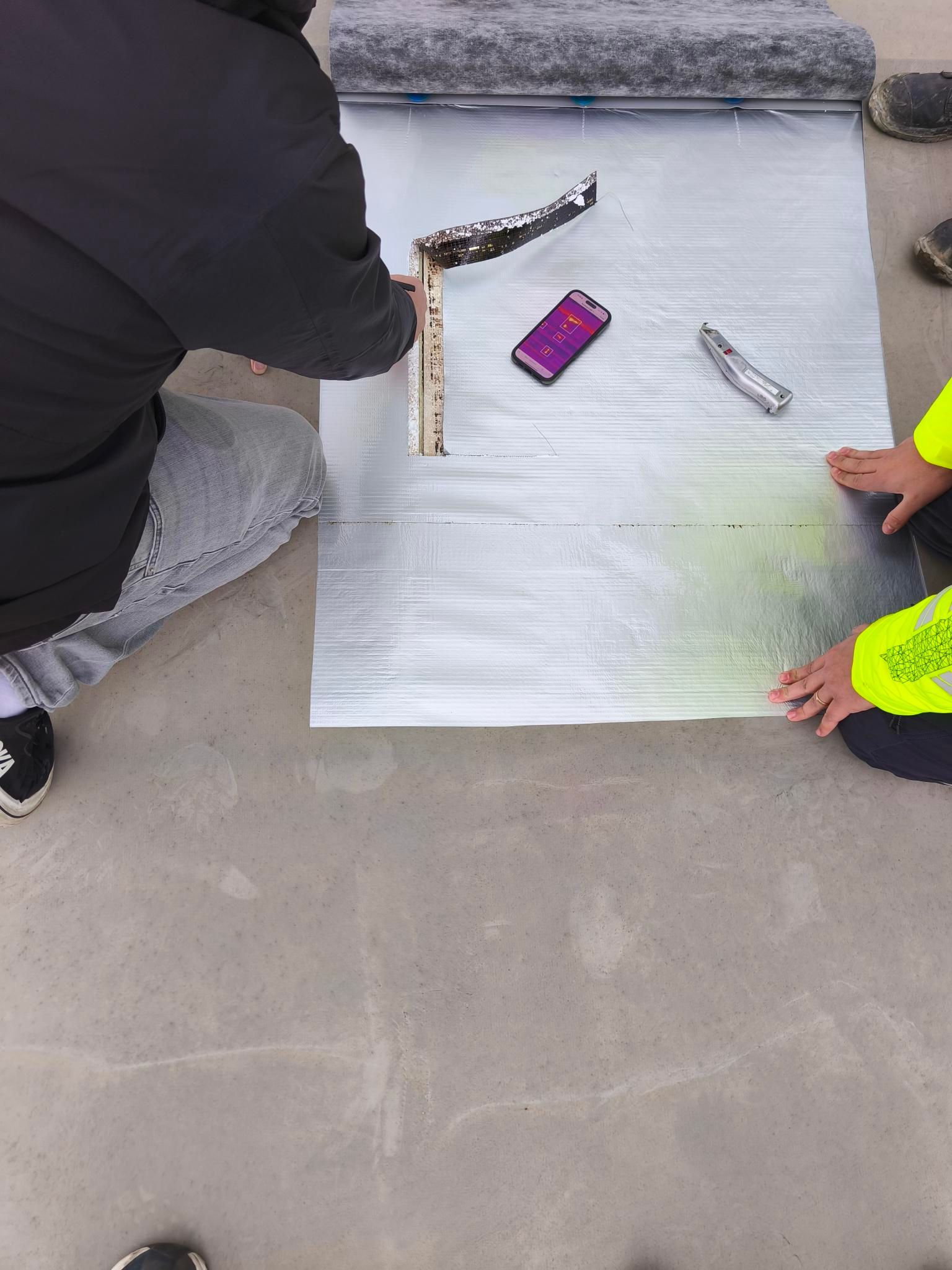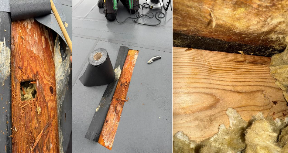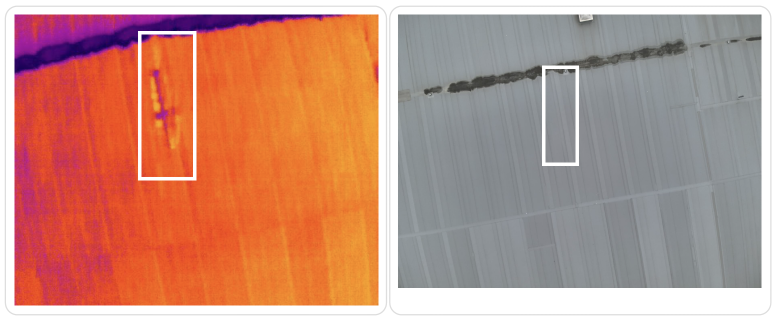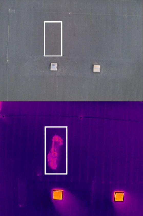Unter der Dachmembran wurde eine erhebliche Feuchtigkeitsansammlung festgestellt, wie das beigefügte Wärmebild zeigt.